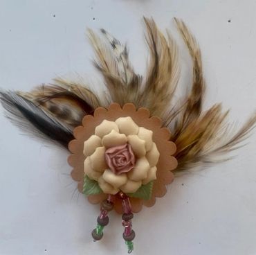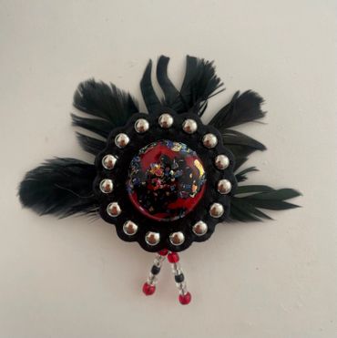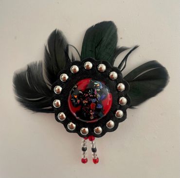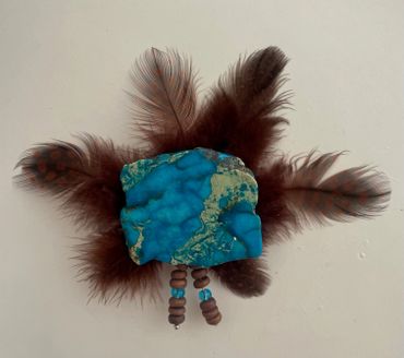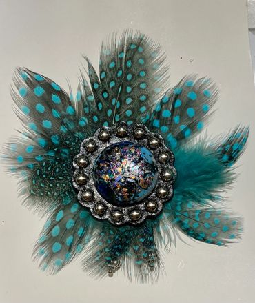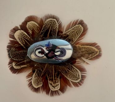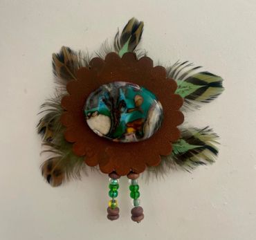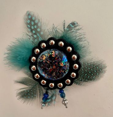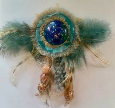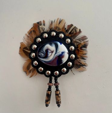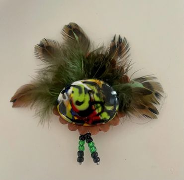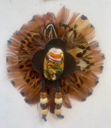 Designs include: fused glass center, feathers, beads and/or leather and each one takes about 3 hours of work to create.